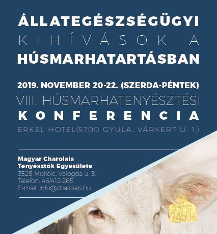 Már elérhetők az előadások diái mellett azok videó felvételei is! A Magyar Charolais Tenyésztők Egyesülete 2019. november 20-22-e között Gyulán, az Erkel Hotelben tartotta meg VIII. húsmarhatenyésztési konferenciáját. Ez alkalommal a húsmarhatartók és -tenyésztők állategészségügyi kihívásai kerültek részletes megtárgyalásra.A VIII. konferenciánk most Gyulán zajlott