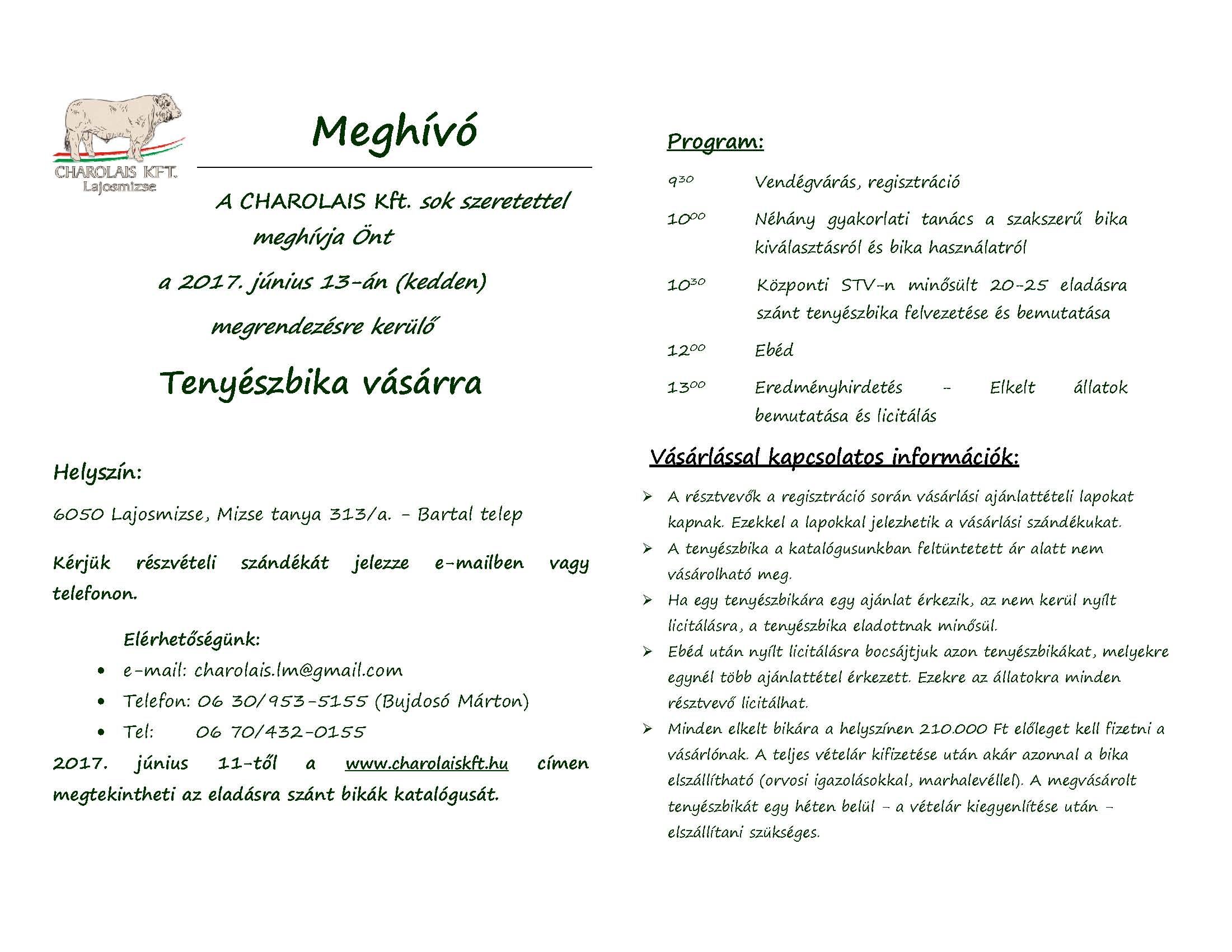 Meghívó A CHAROLAIS Kft. sok szeretettel meghívja Önt a 2017. június 13-án (kedden) megrendezésre kerülő Tenyészbika vásárraKözponti STV bikavásár Lajosmizsén 2017